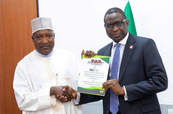 From Left: The Executive Secretary of NEITI, Hon Musa Sarkin Adar, presenting the policy brief titled “Beyond Assent: Pathways for Implementing Nigeria’s New Tax and Revenue Framework” to the Executive Chairman of the Economic and Financial Crimes Commission (EFCC), Mr. Ola Olukoyede, during the courtesy visit by NEITI to EFCC in Abuja.